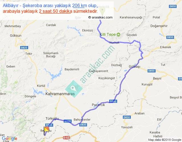 Akbayır - Şekeroba arası yaklaşık olarak 90 km/h ile yukarıda belirtilen sürede olup, iki yerin kuş uçuşu uzaklığı (mesafesi) 111'dir. Yolculuk otobüsle 3 saat 41 dakika sürmektedir.
