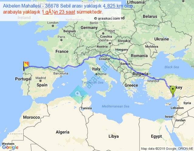 Akbelen Mahallesi - 36678 Sebil arası yaklaşık olarak 90 km/h ile yukarıda belirtilen sürede olup, iki yerin kuş uçuşu uzaklığı (mesafesi) 3681'dir. Eğer belirtilen yerler arasında uçak seferi var ise bu süre uçakla 5 saat 39 dakika'ya kadar düşebilir. Yolculuk otobüsle 2 gün 13 saat sürmektedir.