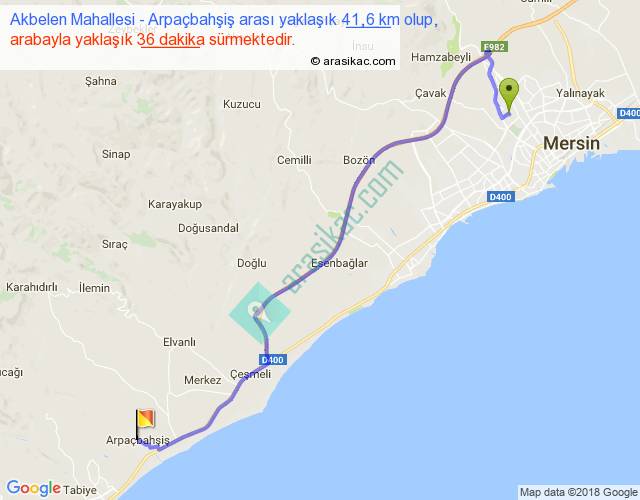 Akbelen Mahallesi - Arpaçbahşiş arası yaklaşık olarak 90 km/h ile yukarıda belirtilen sürede olup, iki yerin kuş uçuşu uzaklığı (mesafesi) 30'dir. Yolculuk otobüsle 46 dakika sürmektedir.
