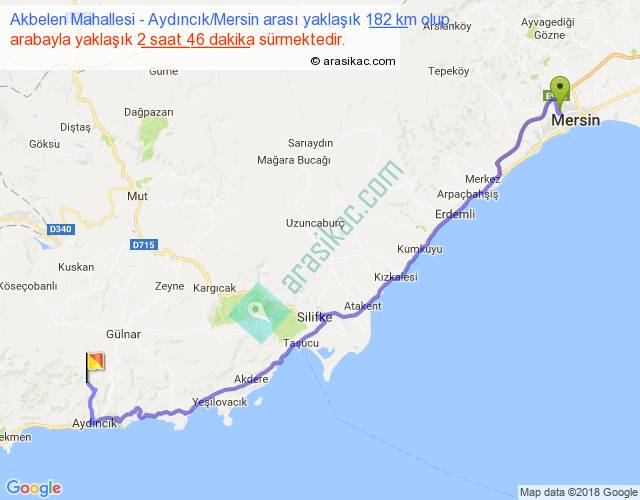 Akbelen Mahallesi - Aydıncık Mersin arası yaklaşık olarak 90 km/h ile yukarıda belirtilen sürede olup, iki yerin kuş uçuşu uzaklığı (mesafesi) 133'dir. Yolculuk otobüsle 3 saat 35 dakika sürmektedir.
