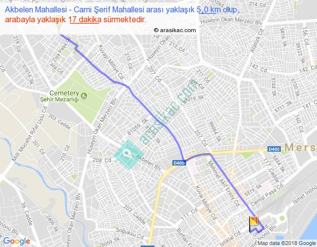 Akbelen Mahallesi - Cami Şerif Mahallesi arası yaklaşık olarak 90 km/h ile yukarıda belirtilen sürede olup, iki yerin kuş uçuşu uzaklığı (mesafesi) 4'dir. Yolculuk otobüsle 22 dakika sürmektedir.