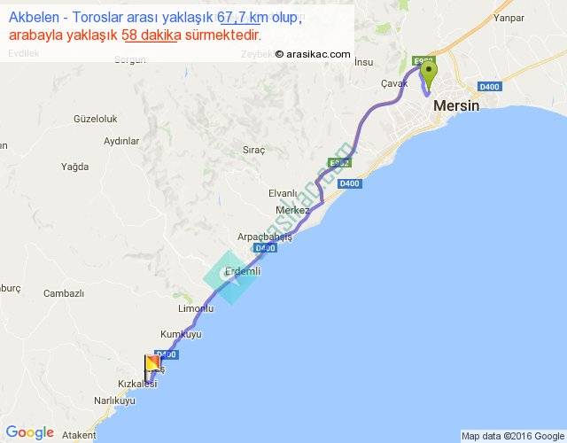 Akbelen - Toroslar arası yaklaşık olarak 90 km/h ile yukarıda belirtilen sürede olup, iki yerin kuş uçuşu uzaklığı (mesafesi) 56'dir. Yolculuk otobüsle 1 saat 15 dakika sürmektedir.