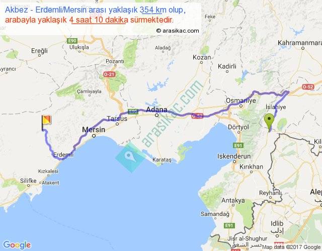 Akbez - Erdemli Mersin arası yaklaşık olarak 90 km/h ile yukarıda belirtilen sürede olup, iki yerin kuş uçuşu uzaklığı (mesafesi) 219'dir. Yolculuk otobüsle 5 saat 25 dakika sürmektedir.