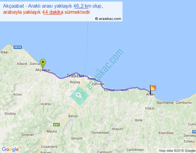 Akçaabat - Araklı arası yaklaşık olarak 90 km/h ile yukarıda belirtilen sürede olup, iki yerin kuş uçuşu uzaklığı (mesafesi) 41'dir. Yolculuk otobüsle 59 dakika sürmektedir.