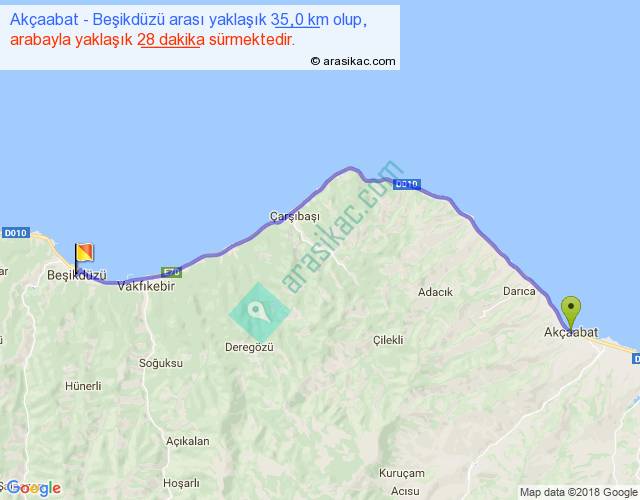 Akçaabat - Beşikdüzü arası yaklaşık olarak 90 km/h ile yukarıda belirtilen sürede olup, iki yerin kuş uçuşu uzaklığı (mesafesi) 29'dir. Yolculuk otobüsle 36 dakika sürmektedir.