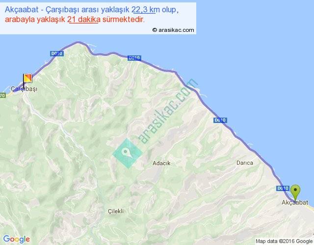 Akçaabat - Çarşıbaşı arası yaklaşık olarak 90 km/h ile yukarıda belirtilen sürede olup, iki yerin kuş uçuşu uzaklığı (mesafesi) 17'dir. Yolculuk otobüsle 27 dakika sürmektedir.