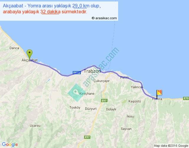 Akçaabat - Yomra arası yaklaşık olarak 90 km/h ile yukarıda belirtilen sürede olup, iki yerin kuş uçuşu uzaklığı (mesafesi) 26'dir. Yolculuk otobüsle 41 dakika sürmektedir.
