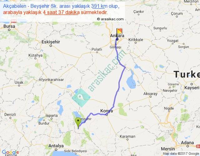 Akçabelen - Beyşehir Sk. arası yaklaşık olarak 90 km/h ile yukarıda belirtilen sürede olup, iki yerin kuş uçuşu uzaklığı (mesafesi) 300'dir. Eğer belirtilen yerler arasında uçak seferi var ise bu süre uçakla 27 dakika'ya kadar düşebilir. Yolculuk otobüsle 6 saat 0 dakika sürmektedir.