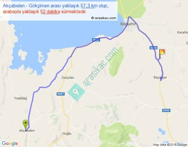 Akçabelen - Gökçimen arası yaklaşık olarak 90 km/h ile yukarıda belirtilen sürede olup, iki yerin kuş uçuşu uzaklığı (mesafesi) 31'dir. Yolculuk otobüsle 1 saat 7 dakika sürmektedir.