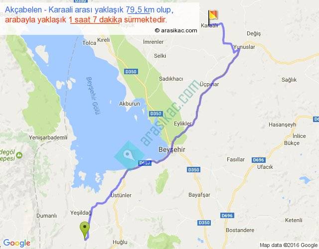 Akçabelen - Karaali arası yaklaşık olarak 90 km/h ile yukarıda belirtilen sürede olup, iki yerin kuş uçuşu uzaklığı (mesafesi) 60'dir. Yolculuk otobüsle 1 saat 27 dakika sürmektedir.