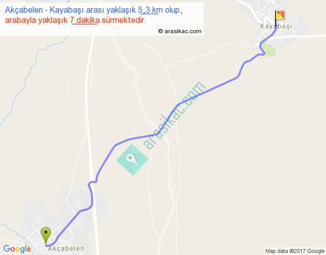 Akçabelen - Kayabaşı arası yaklaşık olarak 90 km/h ile yukarıda belirtilen sürede olup, iki yerin kuş uçuşu uzaklığı (mesafesi) 5'dir. Yolculuk otobüsle 9 dakika sürmektedir.
