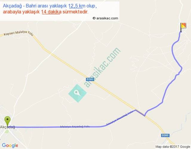 Akçadağ - Bahri arası yaklaşık olarak 90 km/h ile yukarıda belirtilen sürede olup, iki yerin kuş uçuşu uzaklığı (mesafesi) 10'dir. Yolculuk otobüsle 18 dakika sürmektedir.