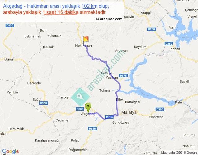Akçadağ - Hekimhan arası yaklaşık olarak 90 km/h ile yukarıda belirtilen sürede olup, iki yerin kuş uçuşu uzaklığı (mesafesi) 52'dir. Yolculuk otobüsle 1 saat 38 dakika sürmektedir.