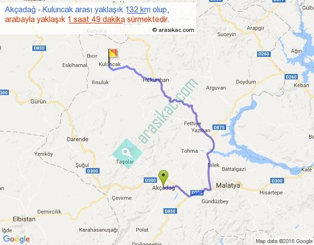 Akçadağ - Kuluncak arası yaklaşık olarak 90 km/h ile yukarıda belirtilen sürede olup, iki yerin kuş uçuşu uzaklığı (mesafesi) 65'dir. Yolculuk otobüsle 2 saat 21 dakika sürmektedir.