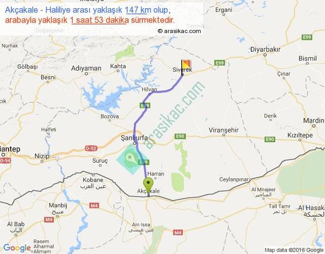 Akçakale - Haliliye arası yaklaşık olarak 90 km/h ile yukarıda belirtilen sürede olup, iki yerin kuş uçuşu uzaklığı (mesafesi) 119'dir. Yolculuk otobüsle 2 saat 26 dakika sürmektedir.