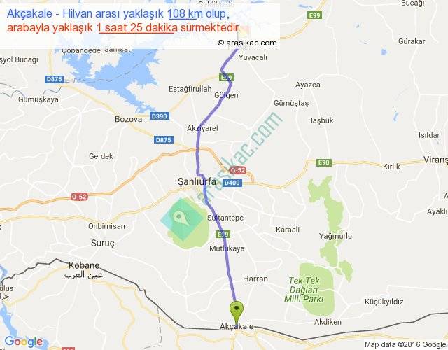 Akçakale - Hilvan arası yaklaşık olarak 90 km/h ile yukarıda belirtilen sürede olup, iki yerin kuş uçuşu uzaklığı (mesafesi) 97'dir. Yolculuk otobüsle 1 saat 50 dakika sürmektedir.