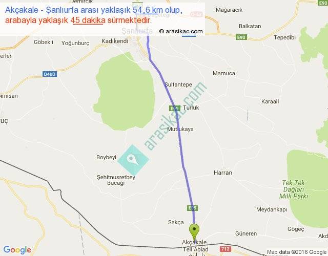 Akçakale - Şanlıurfa arası yaklaşık olarak 90 km/h ile yukarıda belirtilen sürede olup, iki yerin kuş uçuşu uzaklığı (mesafesi) 52'dir. Yolculuk otobüsle 58 dakika sürmektedir.