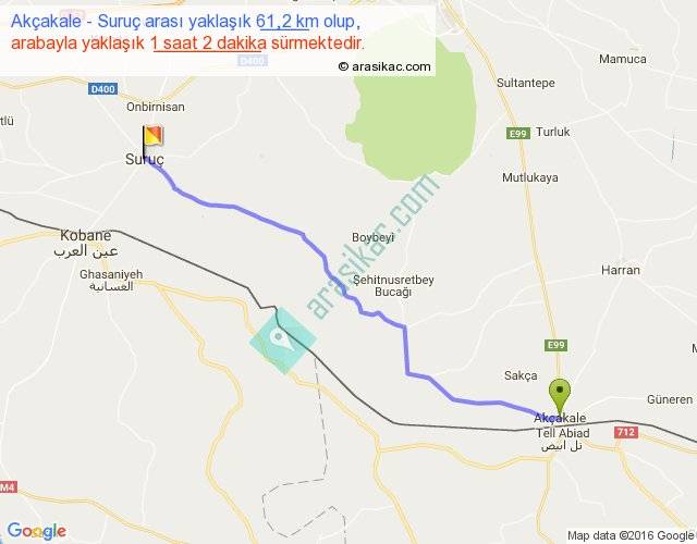 Akçakale - Suruç arası yaklaşık olarak 90 km/h ile yukarıda belirtilen sürede olup, iki yerin kuş uçuşu uzaklığı (mesafesi) 55'dir. Yolculuk otobüsle 1 saat 20 dakika sürmektedir.