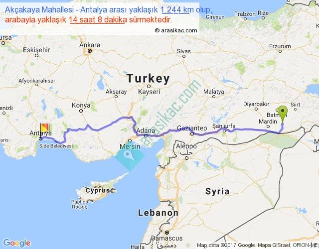 Akçakaya Mahallesi - Antalya arası yaklaşık olarak 90 km/h ile yukarıda belirtilen sürede olup, iki yerin kuş uçuşu uzaklığı (mesafesi) 941'dir. Eğer belirtilen yerler arasında uçak seferi var ise bu süre uçakla 1 saat 26 dakika'ya kadar düşebilir. Yolculuk otobüsle 18 saat 22 dakika sürmektedir.