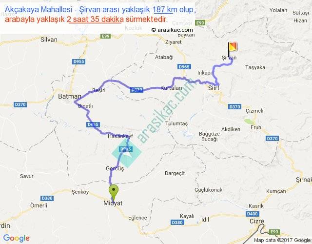Akçakaya Mahallesi - Şirvan arası yaklaşık olarak 90 km/h ile yukarıda belirtilen sürede olup, iki yerin kuş uçuşu uzaklığı (mesafesi) 91'dir. Yolculuk otobüsle 3 saat 21 dakika sürmektedir.
