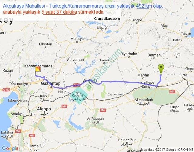 Akçakaya Mahallesi - Türkoğlu Kahramanmaraş arası yaklaşık olarak 90 km/h ile yukarıda belirtilen sürede olup, iki yerin kuş uçuşu uzaklığı (mesafesi) 400'dir. Eğer belirtilen yerler arasında uçak seferi var ise bu süre uçakla 36 dakika'ya kadar düşebilir. Yolculuk otobüsle 7 saat 18 dakika sürmektedir.