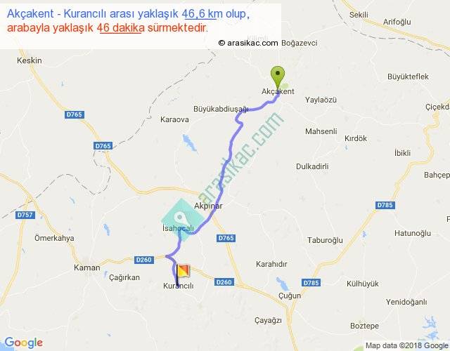 Akçakent - Kurancılı arası yaklaşık olarak 90 km/h ile yukarıda belirtilen sürede olup, iki yerin kuş uçuşu uzaklığı (mesafesi) 36'dir. Yolculuk otobüsle 59 dakika sürmektedir.