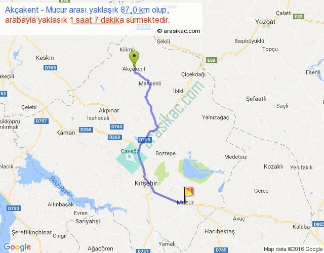Akçakent - Mucur arası yaklaşık olarak 90 km/h ile yukarıda belirtilen sürede olup, iki yerin kuş uçuşu uzaklığı (mesafesi) 66'dir. Yolculuk otobüsle 1 saat 27 dakika sürmektedir.