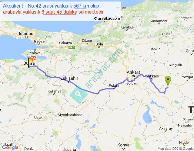 Akçakent - No:42 arası yaklaşık olarak 90 km/h ile yukarıda belirtilen sürede olup, iki yerin kuş uçuşu uzaklığı (mesafesi) 431'dir. Eğer belirtilen yerler arasında uçak seferi var ise bu süre uçakla 39 dakika'ya kadar düşebilir. Yolculuk otobüsle 8 saat 46 dakika sürmektedir.