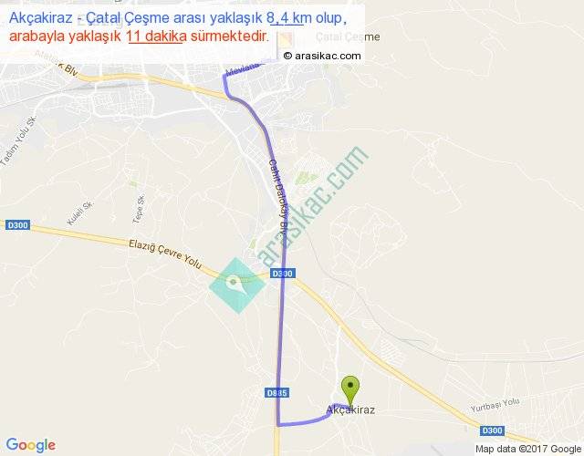 Akçakiraz - Çatal Çeşme arası yaklaşık olarak 90 km/h ile yukarıda belirtilen sürede olup, iki yerin kuş uçuşu uzaklığı (mesafesi) 6'dir. Yolculuk otobüsle 14 dakika sürmektedir.