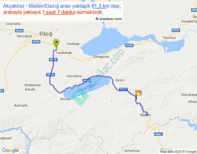 Akçakiraz - Maden Elazığ arası yaklaşık olarak 90 km/h ile yukarıda belirtilen sürede olup, iki yerin kuş uçuşu uzaklığı (mesafesi) 36'dir. Yolculuk otobüsle 1 saat 27 dakika sürmektedir.
