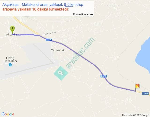 Akçakiraz - Mollakendi arası yaklaşık olarak 90 km/h ile yukarıda belirtilen sürede olup, iki yerin kuş uçuşu uzaklığı (mesafesi) 9'dir. Yolculuk otobüsle 13 dakika sürmektedir.