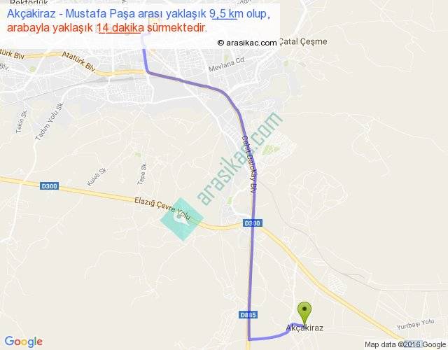 Akçakiraz - Mustafa Paşa arası yaklaşık olarak 90 km/h ile yukarıda belirtilen sürede olup, iki yerin kuş uçuşu uzaklığı (mesafesi) 7'dir. Yolculuk otobüsle 18 dakika sürmektedir.