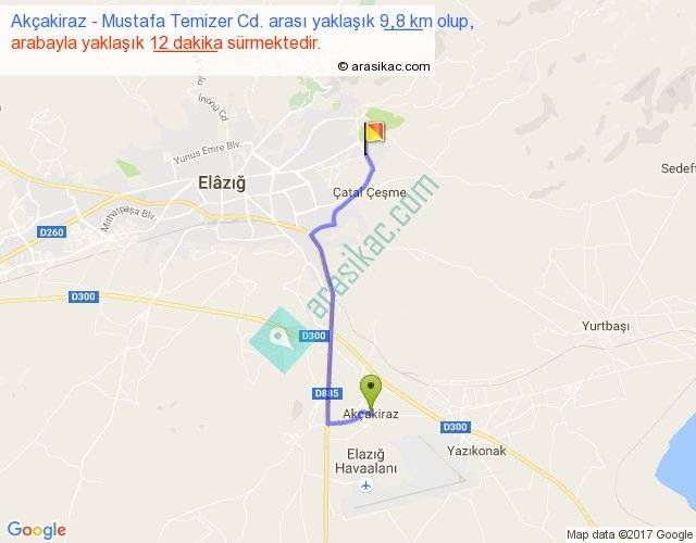 Akçakiraz - Mustafa Temizer Cd. arası yaklaşık olarak 90 km/h ile yukarıda belirtilen sürede olup, iki yerin kuş uçuşu uzaklığı (mesafesi) 7'dir. Yolculuk otobüsle 15 dakika sürmektedir.
