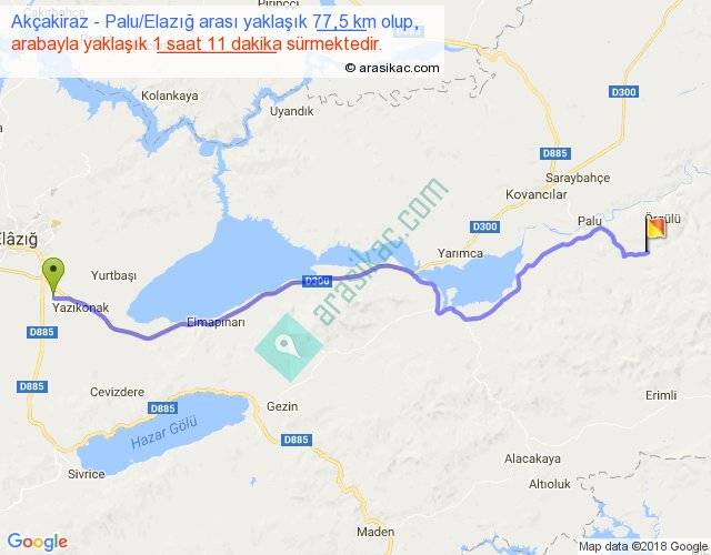 Akçakiraz - Palu Elazığ arası yaklaşık olarak 90 km/h ile yukarıda belirtilen sürede olup, iki yerin kuş uçuşu uzaklığı (mesafesi) 64'dir. Yolculuk otobüsle 1 saat 32 dakika sürmektedir.