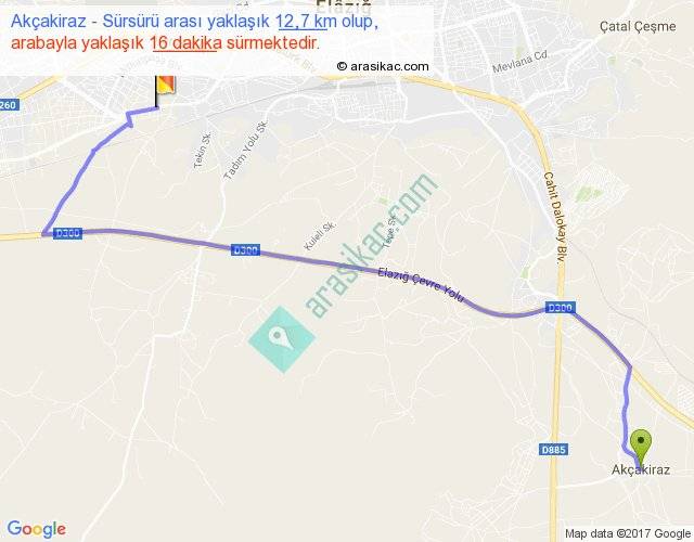Akçakiraz - Sürsürü arası yaklaşık olarak 90 km/h ile yukarıda belirtilen sürede olup, iki yerin kuş uçuşu uzaklığı (mesafesi) 8'dir. Yolculuk otobüsle 20 dakika sürmektedir.