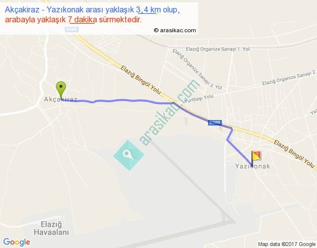 Akçakiraz - Yazıkonak arası yaklaşık olarak 90 km/h ile yukarıda belirtilen sürede olup, iki yerin kuş uçuşu uzaklığı (mesafesi) 3'dir. Yolculuk otobüsle 9 dakika sürmektedir.