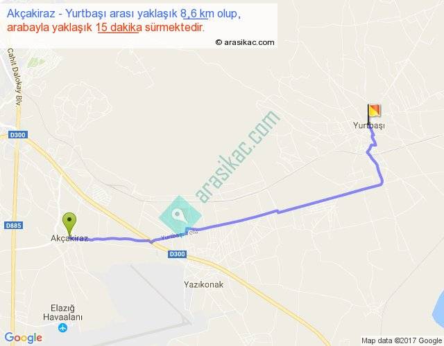 Akçakiraz - Yurtbaşı arası yaklaşık olarak 90 km/h ile yukarıda belirtilen sürede olup, iki yerin kuş uçuşu uzaklığı (mesafesi) 7'dir. Yolculuk otobüsle 19 dakika sürmektedir.