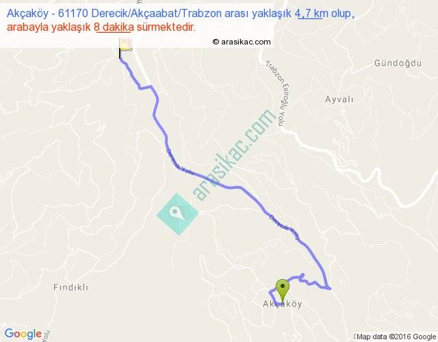 Akçaköy - 61170 Derecik Akçaabat Trabzon arası yaklaşık olarak 90 km/h ile yukarıda belirtilen sürede olup, iki yerin kuş uçuşu uzaklığı (mesafesi) 3'dir. Yolculuk otobüsle 10 dakika sürmektedir.