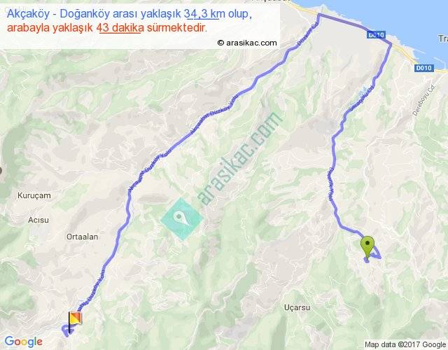 Akçaköy - Doğanköy arası yaklaşık olarak 90 km/h ile yukarıda belirtilen sürede olup, iki yerin kuş uçuşu uzaklığı (mesafesi) 13'dir. Yolculuk otobüsle 55 dakika sürmektedir.