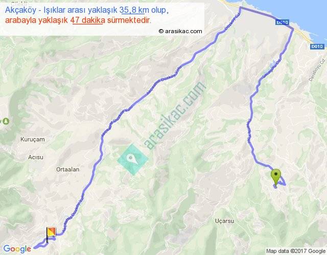 Akçaköy - Işıklar arası yaklaşık olarak 90 km/h ile yukarıda belirtilen sürede olup, iki yerin kuş uçuşu uzaklığı (mesafesi) 13'dir. Yolculuk otobüsle 1 saat 1 dakika sürmektedir.