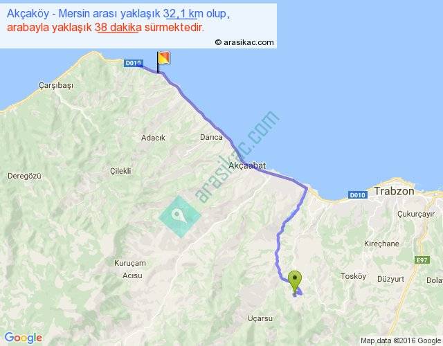 Akçaköy - Mersin arası yaklaşık olarak 90 km/h ile yukarıda belirtilen sürede olup, iki yerin kuş uçuşu uzaklığı (mesafesi) 22'dir. Yolculuk otobüsle 49 dakika sürmektedir.
