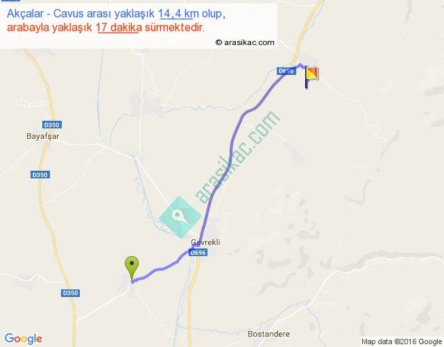 Akçalar - Cavus arası yaklaşık olarak 90 km/h ile yukarıda belirtilen sürede olup, iki yerin kuş uçuşu uzaklığı (mesafesi) 11'dir. Yolculuk otobüsle 22 dakika sürmektedir.