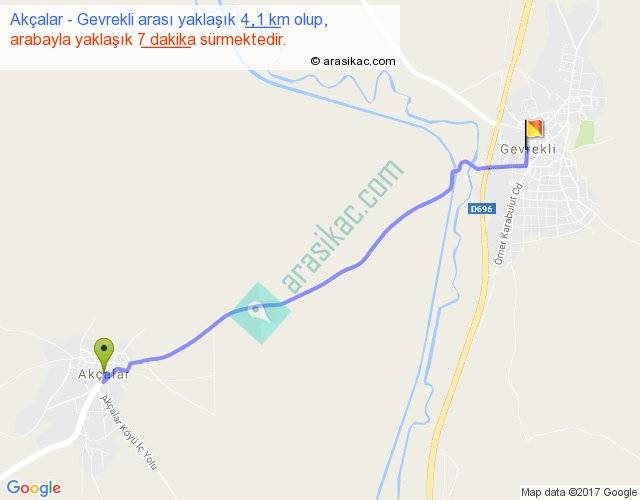 Akçalar - Gevrekli arası yaklaşık olarak 90 km/h ile yukarıda belirtilen sürede olup, iki yerin kuş uçuşu uzaklığı (mesafesi) 4'dir. Yolculuk otobüsle 9 dakika sürmektedir.