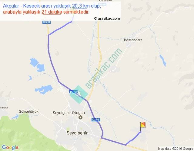 Akçalar - Kesecik arası yaklaşık olarak 90 km/h ile yukarıda belirtilen sürede olup, iki yerin kuş uçuşu uzaklığı (mesafesi) 13'dir. Yolculuk otobüsle 27 dakika sürmektedir.