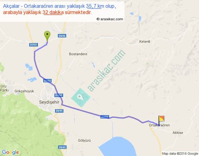 Akçalar - Ortakaraören arası yaklaşık olarak 90 km/h ile yukarıda belirtilen sürede olup, iki yerin kuş uçuşu uzaklığı (mesafesi) 27'dir. Yolculuk otobüsle 41 dakika sürmektedir.