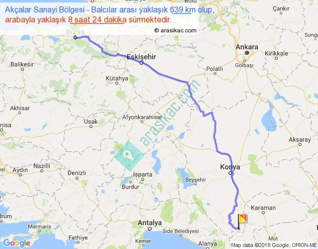 Akçalar Sanayi Bölgesi - Balcılar arası yaklaşık olarak 90 km/h ile yukarıda belirtilen sürede olup, iki yerin kuş uçuşu uzaklığı (mesafesi) 480'dir. Eğer belirtilen yerler arasında uçak seferi var ise bu süre uçakla 44 dakika'ya kadar düşebilir. Yolculuk otobüsle 10 saat 55 dakika sürmektedir.