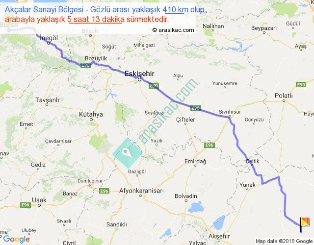 Akçalar Sanayi Bölgesi - Gözlü arası yaklaşık olarak 90 km/h ile yukarıda belirtilen sürede olup, iki yerin kuş uçuşu uzaklığı (mesafesi) 341'dir. Eğer belirtilen yerler arasında uçak seferi var ise bu süre uçakla 31 dakika'ya kadar düşebilir. Yolculuk otobüsle 6 saat 46 dakika sürmektedir.