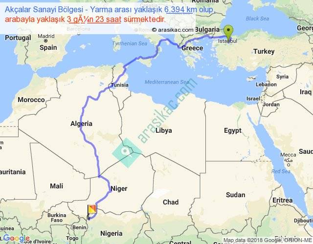Akçalar Sanayi Bölgesi - Yarma arası yaklaşık olarak 90 km/h ile yukarıda belirtilen sürede olup, iki yerin kuş uçuşu uzaklığı (mesafesi) 3959'dir. Eğer belirtilen yerler arasında uçak seferi var ise bu süre uçakla 6 saat 05 dakika'ya kadar düşebilir. Yolculuk otobüsle 5 gün 3 saat sürmektedir.