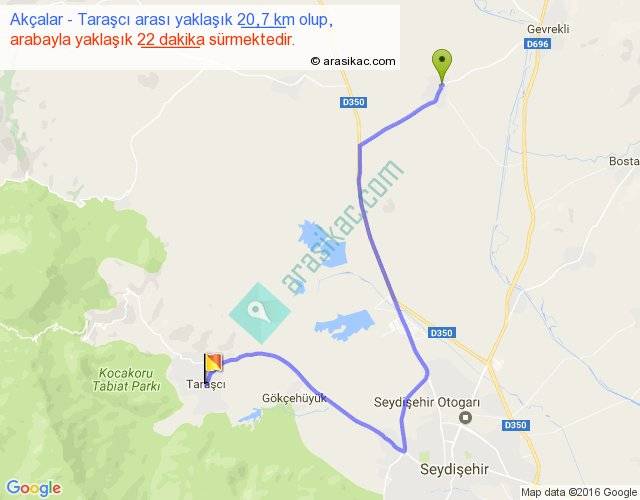 Akçalar - Taraşcı arası yaklaşık olarak 90 km/h ile yukarıda belirtilen sürede olup, iki yerin kuş uçuşu uzaklığı (mesafesi) 11'dir. Yolculuk otobüsle 28 dakika sürmektedir.
