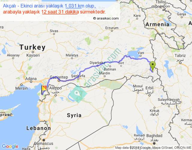 Akçalı - Ekinci arası yaklaşık olarak 90 km/h ile yukarıda belirtilen sürede olup, iki yerin kuş uçuşu uzaklığı (mesafesi) 731'dir. Eğer belirtilen yerler arasında uçak seferi var ise bu süre uçakla 1 saat 07 dakika'ya kadar düşebilir. Yolculuk otobüsle 16 saat 16 dakika sürmektedir.
